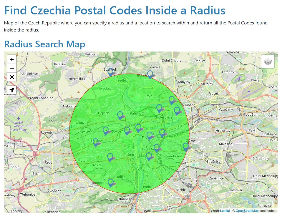 Map of the Czech Republic where you can specify a radius and a location to search within and return all the Postal Codes found inside the radius.